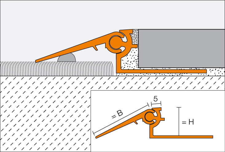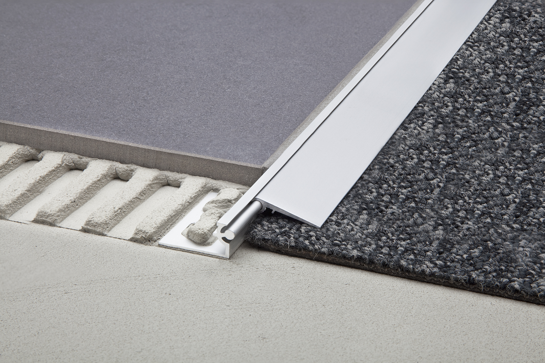| Toepassing | Schlüter®-RENO-V is een profiel met een variabel overgangsvlak voor het traploos verbinden van vloerbekledingen van verschillende hoogte, bijv. ter hoogte van de overgang van tegels op tapijt. Daarnaast beschermt het ook de aangrenzende randen van de bekleding. Dankzij het variabel scharnierend afdekvlak past het profiel zich in elke inbouw- situatie aan de hoogte van de aangrenzende bekleding aan. Op die manier wordt een struikelrand tussen bekledingen van verschillende hoogte voorkomen. Schlüter®-RENO-V kan ook worden toegepast in zwaarder belaste vloeren (inritten van garages en loodsen). In deze situaties dient de ruimte onder het variabele overgangsvlak eventueel met mortel te worden opgevuld. | |